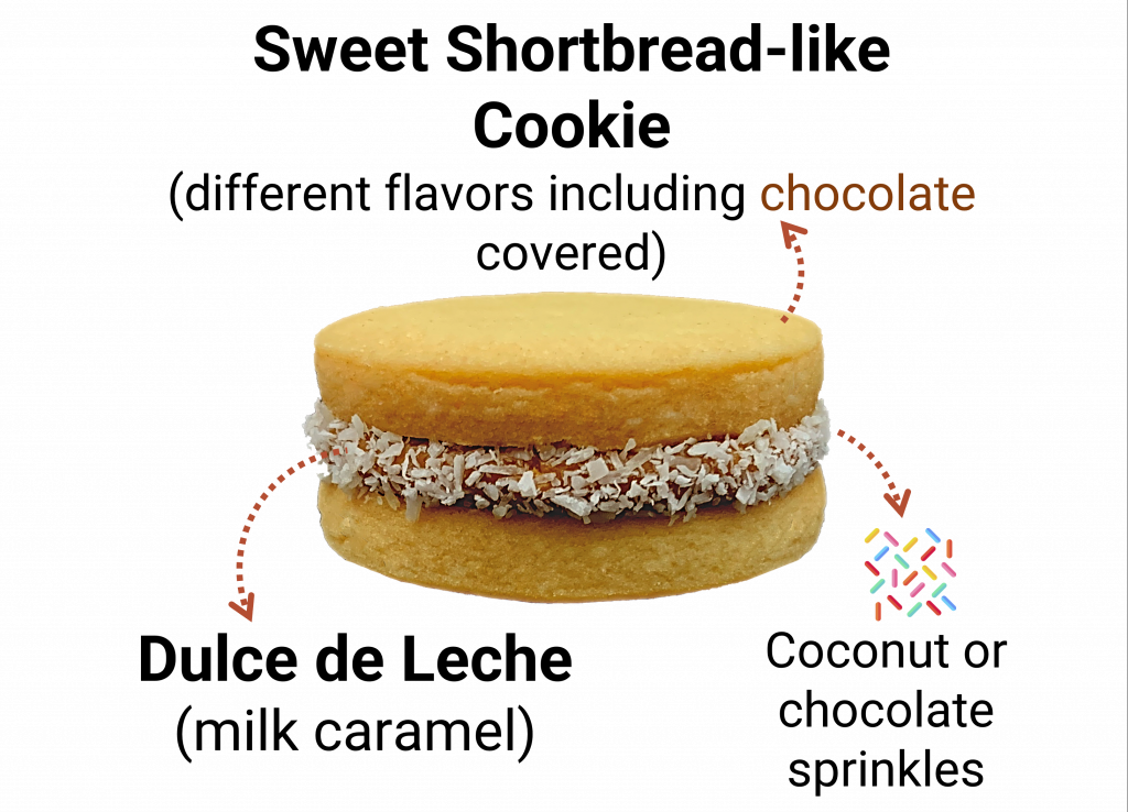 Alfajores are a beloved pastry dessert enjoyed throughout Latin America, particularly in Argentina, Peru, and Uruguay. Alfajores are ranked in the Top 5 best cookies in the world according Taste-Atlas. These sweet treats consist of two shortbread-like cookies that are sandwiched together with a filling, typically the best sweet ever dulce de leche, and then coated in powdered sugar, grated coconut, or chocolate. They are often enjoyed as a midday snack or dessert, alongside a cup of coffee or tea.